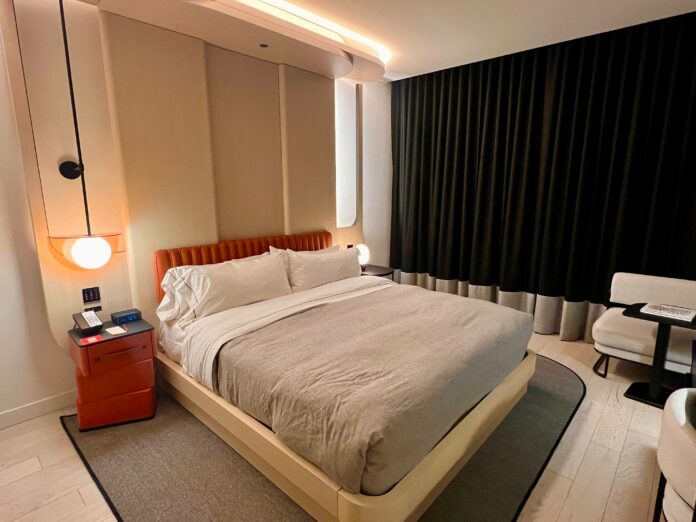 Stepping in to the bedroom, we see a king bed topped by a canopy headboard, which is a signature feature of the Canopy by Hilton brand.